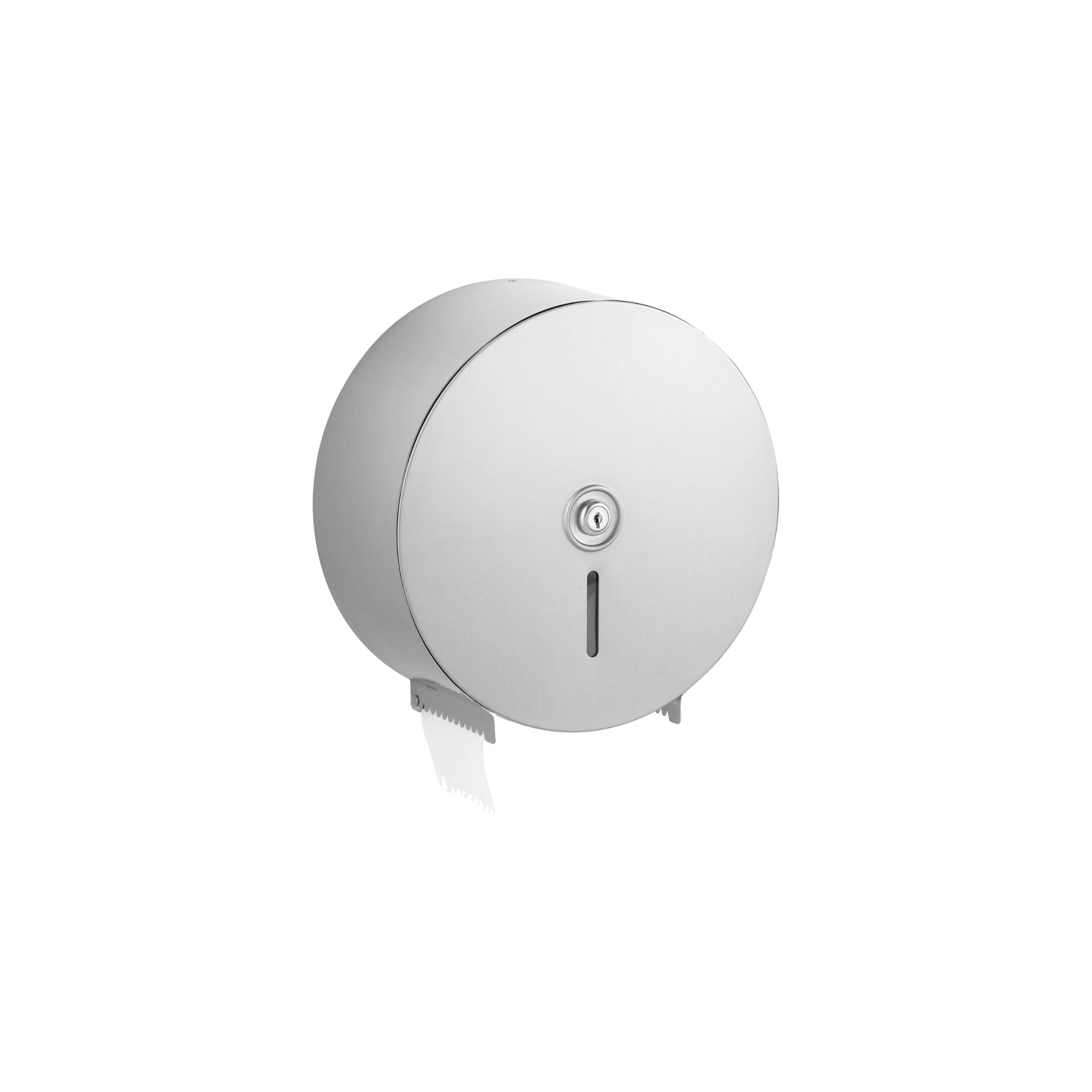 Satin-finish stainless steel. Equipped with a lock keyed like other washroom accessories. Spindle holds one 10″ (255mm) diameter core roll; convertible for 3″ (76mm) diameter core rolls. Rubber o-rings (2) (furnished by manufacturer) may be added to the steel inner spindle to accommodate a 2-1/8″ (55mm) diameter core roll. Stainless steel mounting plate. Slot reveals tissue supply. Unit 10-21/32″ W, 10-5/8″ H, 4-1/2″ D (270 x 270 x 115mm).